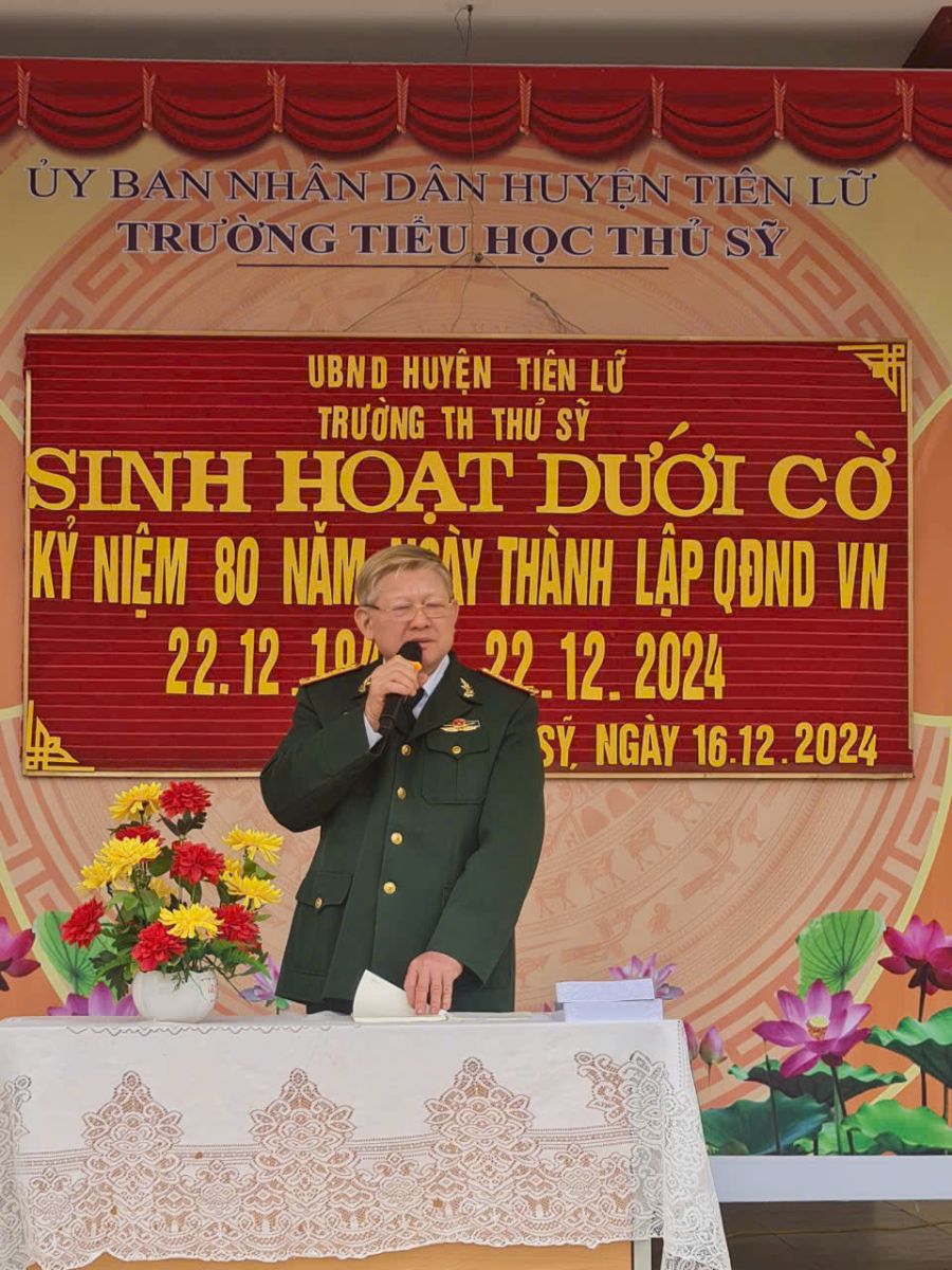 Đặc biệt, nhằm ôn lại lịch sử và ý nghĩa ngày thành lập Quân đội nhân dân Việt Nam 22/12, sáng ngày 16/12/2024, nhà trường đã tổ chức sinh hoạt dưới cờ chủ điểm “Uống nước nhớ nguồn”. Đến dự buổi sinh hoạt có Hội Cựu chiến binh xã Thủ Sỹ, BGH nhà trường, các thầy cô giáo và học sinh. Mở đầu là các tiết mục văn nghệ chào mừng do các em học sinh biểu diễn; những lời ca, tiếng hát vang lên thể hiện sự ngưỡng mộ, niềm tự hào của thế hệ trẻ với các thế hệ cha anh đi trước đã không tiếc máu xương để đem lại nền độc lập cho dân tộc.